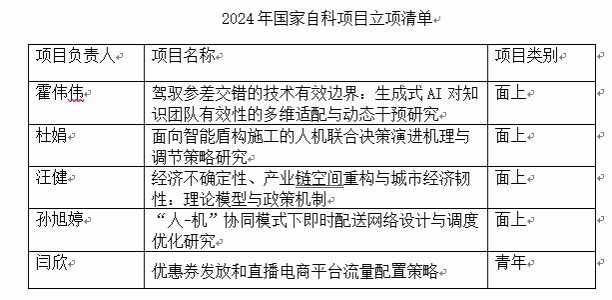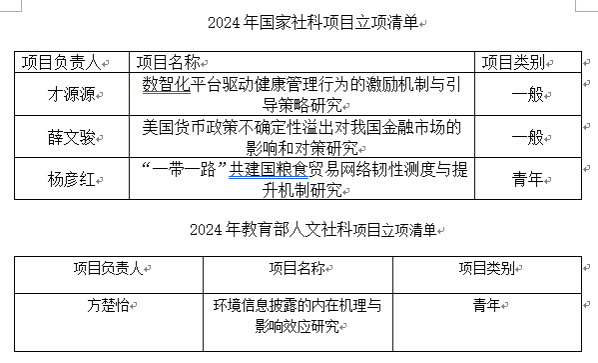 金秋九月,天高云淡,正是收获的季节,也是科研工作者们辛勤付出得到结果的季节。此时,随着国家社科基金项目评审结果公布,2138CC太阳集团本年度国家级科研项目立项数量再创历史新高!学院教师在2024年度国家自然科学项目和国家社会科学项目立项角逐中,共斩获8项;此外,教育部人文社科项目获批1项。 国家自科项目共有5位教师获得立项,包括面上项目4项,青年项目1项。霍伟伟、杜娟、汪健、孙旭婷四位老师获得国家自科面上项目立项,闫欣老师获得青年项目立项。 国家社科项目共有3位教师获得立项,包括一般项目2项,青年项目1项。才源源、薛文骏两位老师获得国家社科一般项目立项,杨彦红老师获得青年项目立项。 向各位课题负责人表示热烈祝贺!今年学院将迎来AACSB再认证,这些成果的取得将为学院科研发展注入新的动力,也为即将到来的AACSB再认证添上靓丽的一笔。 |