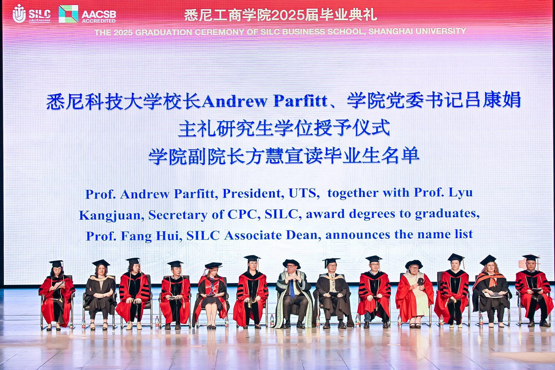 悉尼科技大学校长Andrew Parfitt、学院党委书记吕康娟主礼研究生学位授予仪式;学院副院长方慧宣读毕业生名单。悉尼科技大学副校长Leo Mian Liu、学院院长卞亦文主礼本科生学位授予仪式;学院副院长霍伟伟宣读毕业生名单。