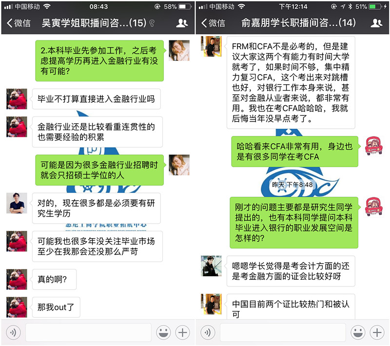 在本次职播间的行业咨询中,两位校友立足于自身的从业经验和经历,从同学们关心的行业发展走势,求职门槛、学历要求,行业需求素养等方面详细给予了自己的独到见解和中肯解答。本次线上行业资讯交流活动,帮助同学们加深了对金融和银行行业的了解,以及对自身今后的发展规划引发新的思考。