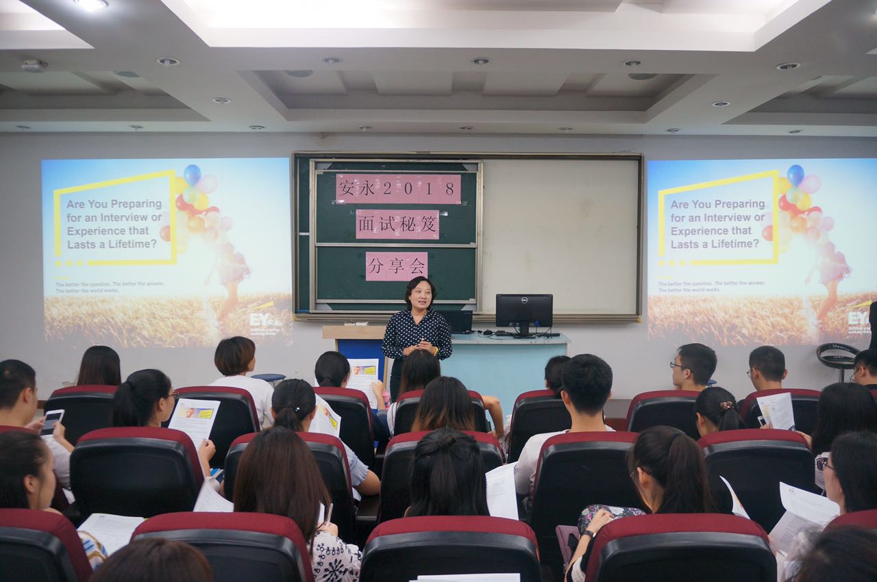 2017年9月27日晚上六点,安永2018面试秘笈分享会在2138cc太阳集团嘉定校区文德楼一楼报告厅举行,吸引了200余名学生到场参与。本场安永宣讲会共分为4个部分:面试秘笈分享、模拟面试、了解安永以及问答环节,不同于常规的宣讲会,本次宣讲会对于大家耳熟能详的企业简介涉及较少,而是着重面试技巧的分享,为学生在面试中能够发挥除自己最好的水平提出了很多实用的建议。值得一提的是,今天出席的还有来自我院06级的学长Sky,同时也是安永的TAS manager,学长通过分享自己的亲身经历以及面试技巧,让同学们收获了许多实际有效的求职经验。