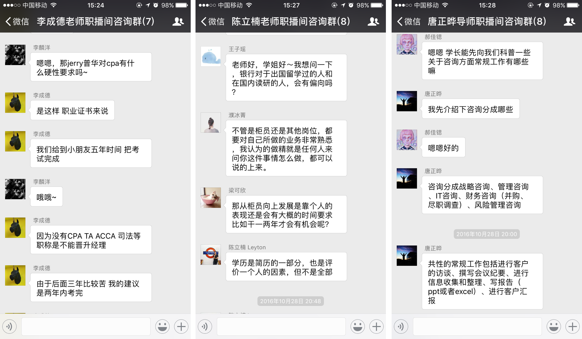 2016年10月28日晚上8点整,本次职业导航月的特色线上交流活动——“职播间”准时在微信平台上进行。这次活动特别邀请了三位分别来自咨询、银行和税务行业的校友,他们分别是科尔尼咨询项目经理唐正晔校友,南洋商业银行上海徐汇支行行长陈立楠校友和普华永道税务咨询高级经理李成德校友。活动一经推出就受到了同学们广泛的参与,许多同学纷纷报名,最终共有17位同学参与了本次职播间的活动。本次活动按照行业类型分为咨询、银行和税务三个模块,主要是通过线上学生提问,校友答疑解惑并提供建议的方式进行。