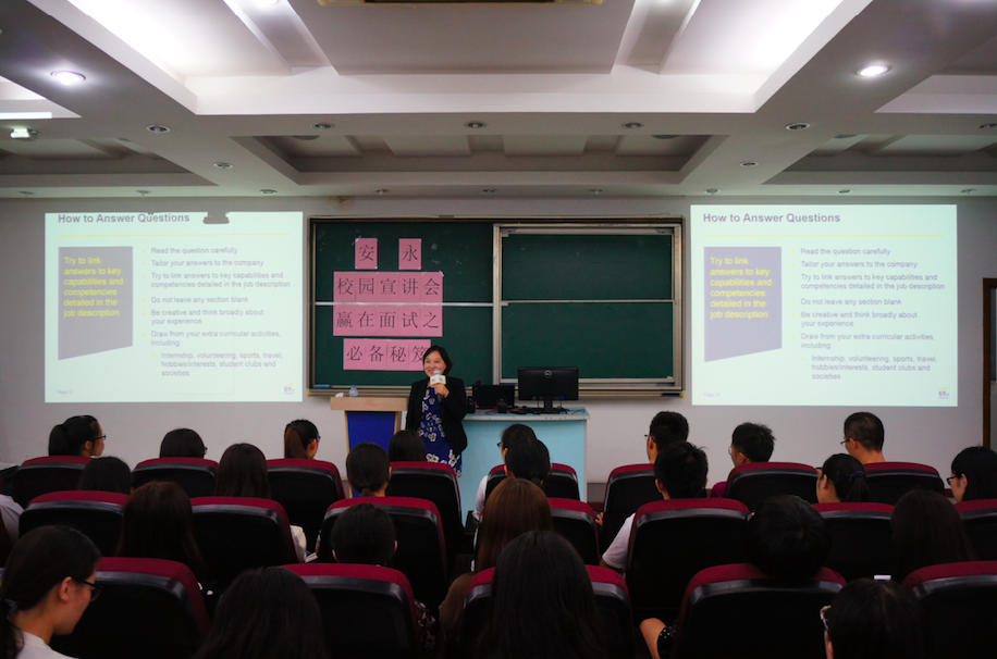 2016年9月27日和10月12日,安永系列宣讲会在2138cc太阳集团嘉定区文德楼报告厅举行。9月27日星期二晚18:30,初次宣讲会在2138cc太阳集团嘉定校区文德一楼报告厅举行,本次宣讲会的主题为“赢在面试—必备秘笈”。本次宣讲会主题实用,吸引了很多悉商学子前去听讲,一楼报告厅里座无虚席,甚至有不少加座。10月12日星期三晚18:30,以“赢在面试—面试潜规则”为主题的宣讲会如期而至,受邀同学准时到达文德三楼报告厅,继续吸取面试经验和面试技巧。两次宣讲会都由安永的人力资源经理吴士敏女士进行主讲,给大家带来了大量的实战信息。