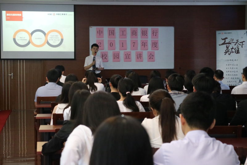 宣讲会介绍了“我们是谁”、“我们有什么”与“Join us”。第一部分主要介绍了工行的发展历程、荣誉成就、特有的集团化管理与覆盖面极广的经营业务。与工行的企业文化相映照,工行在社会责任方面承担了相当的一部分。工行有广阔的发展平台和专业的培训体系,全面的员工的薪酬福利和优质的办公环境也十分吸引人。最后,工行强调了招聘的相关事宜,包括报名流程、招聘条件等。经过一场全面细致的宣讲会,在座的同学对中国工商银行以及接下来的面试有了一个初步的了解。