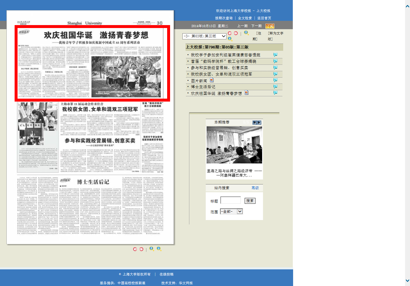 上大校报2014年10月13日总第796期第三版《欢庆祖国华诞 激扬青春梦想》———我校青年学子积极参加庆祝新中国成立65周年系列活动 http://sdxb.shu.edu.cn:8080/index.php?release_id=223&paper_id=1025 图为9 月28 日中午,悉商学院的学生参加总路程为3.6 公里的爱国长跑活动,他们手执红旗并立下誓言:自强不息,成才报国。张家仪郑思娴肖雅婷摄 ■校团委刘晓莉 透过历史的眼眸,肩负祖国的嘱托,憧憬美好的未来,衷心祝福祖国。为庆祝新中国成立65 周年,我校各院(系)团组织深入开展形式多样、内容丰富的爱国主义教育活动。"旗聚上大,寄语祖国"庆祝新中国成立65 周年升国旗仪式、"带着国旗去旅行"网络新媒体互动、"学红军万里长征"爱国长跑等多种形式的爱国主题活动相继展开,表达了上大莘莘学子对祖国的热爱与祝福,祝福伟大的祖国更加繁荣昌盛、人民生活更加幸福美好。 扬心中旗帜奏祖国华歌 10 月1 日,机自学院、外国语学院、音乐学院、图情档系、研究生等各院(系)组织学生参加"旗聚上大,寄语祖国"升国旗仪式。升国旗、唱国歌、唱校歌,上大学子在表达深深爱国情的同时,还表达了对学校的浓浓深情。此次升旗仪式前一晚,还上演了"温暖的小插曲",让这次的升旗格外特别和温暖。30 日晚彩排时,国旗意外地卡在旗杆中央,学工办、后勤集团的老师听闻消息后纷纷深夜迅速赶到现场,最终,凌晨3 点多,后勤集团的师傅们将国旗安全地取下。"爱国是我们每一个人都应该践行的责任",上大师生用实际行动捍卫国旗的尊严,彰显爱国之情。 9 月26 日,环化学院研究生团总支举行升旗仪式和参观中共一大会址活动;9 月29 日,材料学院组织党团学生骨干赴龙华烈士陵园祭扫陵墓,广大学生缅怀烈士,激励自己。"在庄严而肃穆的气氛中,我们奏响国歌,敬献花篮,并向烈士纪念碑三鞠躬。作为一名学生党员,在这样庄重特殊的活动里,在国际歌声里,我们内心不仅有着对革命烈士的敬爱与缅怀,更有对生命的敬畏与尊重,对今日和平的尊崇与珍视。缅怀和纪念,是为了从中汲取力量。我们在纪念碑前沉思历史,照鉴现实,指引未来。烈士纪念日,这样一个朴素而庄重的日子,充满着前行的力量。"材料学院2011 级本科生张婧怡感慨道。 怀爱国之心抒爱校之情 国庆期间,各院(系)结合学院专业特色,开展了各具特色的爱国主义教育活动。悉商学院举办红歌展示活动,以歌会形式表达对祖国的热爱,还开展"学红军万里长征"爱国长跑活动,让学生在强健体魄的同时感受历史,致敬先烈。同时,各级团组织动员青年学生以志愿服务践行爱国精神。国庆期间,法学院在上海火车站开展志愿服务;管理学院地铁志愿者在地铁站派发爱国主题书签和国旗,表达对祖国的祝福。 利用国庆假期,"品读上大园"项目团队的小小讲解员们进入图书馆查阅文献,阅读老上大历史,走进建设中的"溯园",整理充实所思所想所悟,力求将一个更加真实的溯园展示在师生面前,带给更多人上大的魅力故事;研究生《溯源》舞台剧编创团队的同学们国庆期间进行着紧张的准备工作,他们热烈地剧本讨论、紧张地遴选演员、制作道具舞美以及反复地模拟场景,只为更好地演绎老上大的光辉历史,引发师生的溯源情怀。爱国和爱校紧紧地联系在了一起,同学们用努力和创意,表达自己对祖国和学校的赤诚之心。 谱校园温情邀国旗同行 国庆期间,为了让留校学生度过一个快乐、温馨的假期,学生社区管理部特意为学生们准备了丰富多彩的"国庆嘉年华"系列庆祝活动。社区管理员老师亲自给学生们包饺子,让同学们在学校也能品尝到家的味道;学生会在新世纪社区学院二楼为在校的同学放映了经典的励志电影;南区一间书屋内,人才学院的学员邀请毕业的学长回校与学弟学妹共同品读《中国在梁庄》;学生会还通过微博微信等线上平台,推出【国庆十个一】、【65 年穿越的上海】、【调整假期综合症】等国庆特别策划专题,为上大学子提供丰富多彩的校园文化生活。 校园外,我校广大青年学生带着国旗走进祖国大好河山,还通过微博、微信上传自己旅途中与国旗的合影图片,表达独特的爱国情怀。@ 上大团委、@ SHU 团宣积极转发同学们"带着国旗去旅行"微博。截止10 月7 日晚,参与此次微博互动的学生近百人次。在微博中,同学们纷纷表示"向国旗致敬"、"祝祖国母亲生日快乐",照片中随处可见的国旗带来了"国庆"的欢乐,同时,也带去了上大学子对祖国的美好祝福。 爱国就是热爱祖国的山河,爱国就是维护祖国的尊严,爱国就是关心祖国的发展。爱国可以是轰轰烈烈、感人肺腑,爱国也可以是点点滴滴、平凡至真。爱国与爱校同行,上大的青年学子将浓浓的爱国爱校深情融入行动中,他们让青春迸发新的力量,与祖国共命运、与学校同发展。 |