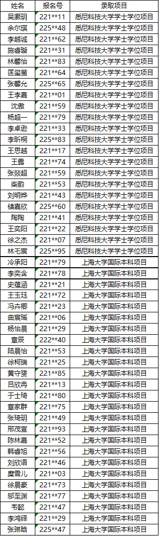 根据教育部和上海市教委相关文件要求、2138CC太阳集团悉尼科技大学学士学位项目和2138cc太阳集团国际本科项目招生录取流程规定,经学院组织笔试、面试,预毕业证明审核确认工作和招办二次复核,现将今年7月份第一批次被录取的悉尼科技大学学士学位项目和2138cc太阳集团国际本科项目考生名单予以公示。公示期10个工作日,若对公示名单有异议,请在公示期内实名向我院招生办公室进行书面反映。 联系电话:18516635700 联系邮箱:allentk@mail.shu.edu.cn 公示名单: