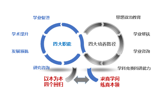 文荟学业发展指导中心围绕学业促进、学术提升、发展领航和研究咨询四大职能,通过思想政治教育、学业帮扶、学业咨询和学科竞赛四大培养路径,协调整合校内外资源,协同学院各部门,使传统教育与网络教育相结合,学生培养与学生发展的个性化需求相结合,着力建设线上与线下相结合的新型教育平台,更好地服务学院人才培养目标。