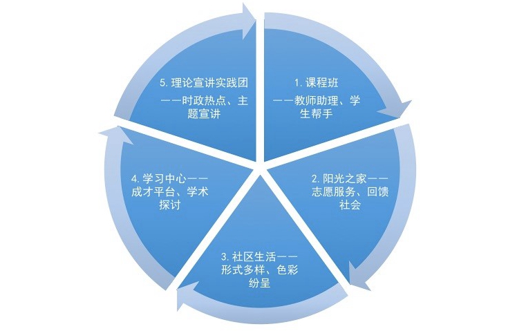 “党员示范岗”项目有五个成熟的板块:课程班、“阳光之家”志愿服务、学生社区、学习场所、理论宣讲实践团。