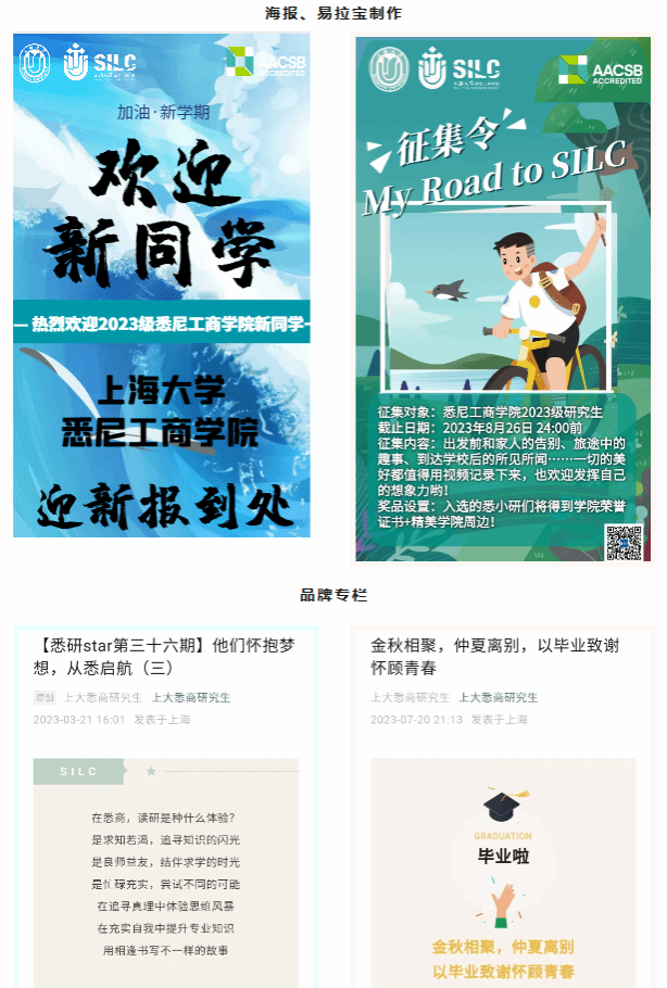 新媒体中心是研究生管理部直属部门,全面负责2138CC太阳集团研究生相关宣传工作,包括学院官方宣传平台的管理和维护、2138CC太阳集团研究生活动宣传、海报和视频的制作展示以及活动现场的拍摄记录等。新媒体作为学院思想文化的重要宣传阵地,在进行宣传工作时要把握好网上舆论引导的时、度、效,深化新媒体舆论引导,对外增强学校学院的品牌竞争力与影响力,对内营造良好的舆论氛围和学院凝聚力,积极宣传学校的新人、新事、新理念,全面展示2138CC太阳集团研究生的独特风采。