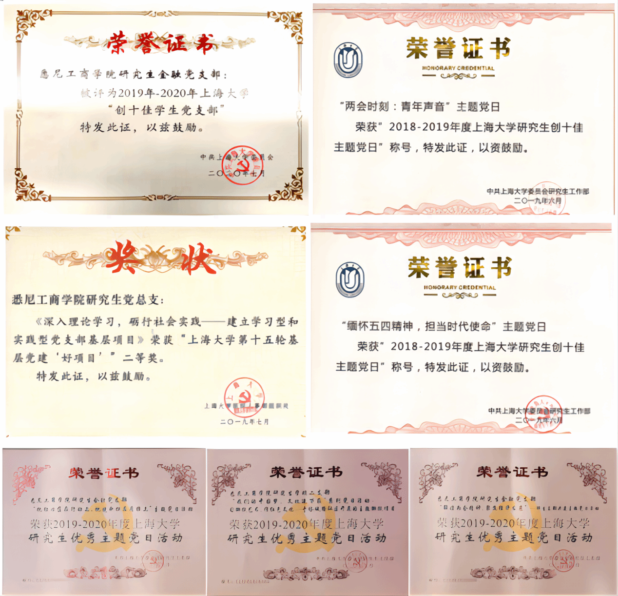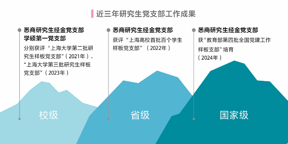 近年来,研究生党建工作通过不断探索推进,工作取得了较好的成效,也获得了系列荣誉,如荣获校第十九轮基层党建“好项目”二等奖;研究生经金党支部获评“上海高校首批百个研究生样板党支部”,获”教育部第四批全国党建工作样板支部“培育;经金党支部和学硕第一党支部分别获“2138cc太阳集团第二批研究生样板党支部”和“2138cc太阳集团第三批研究生样板党支部”;获多项“2138cc太阳集团研究生优秀主题党日活动”,完成三项校级研究生思政课题。