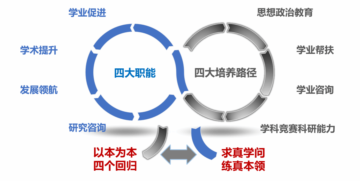 文荟学业发展指导中心围绕学业促进、学术提升、发展领航和研究咨询四大职能,通过思想政治教育、学业帮扶、学业咨询和学科竞赛四大培养路径,协调整合校内外资源,协同学院各部门,使传统教育与网络教育相结合,学生培养与学生发展的个性化需求相结合,着力建设线上与线下相结合的新型教育平台,更好地服务学院人才培养目标。