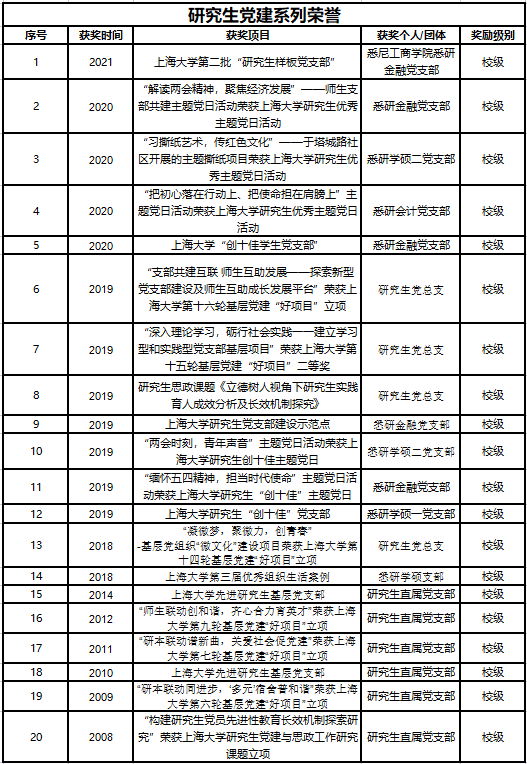 近年来,研究生党建工作通过不断探索推进,工作取得了较好的成效,也获得了系列荣誉,如荣获校第十五轮基层党建“好项目”二等奖、2138cc太阳集团研究生党支部建设示范点、创十佳支部、以及创十佳主题党日活动等多项奖项,完成一项校级研究生思政课题《立德树人视角下研究生实践育人成效分析及长效机制探究》。