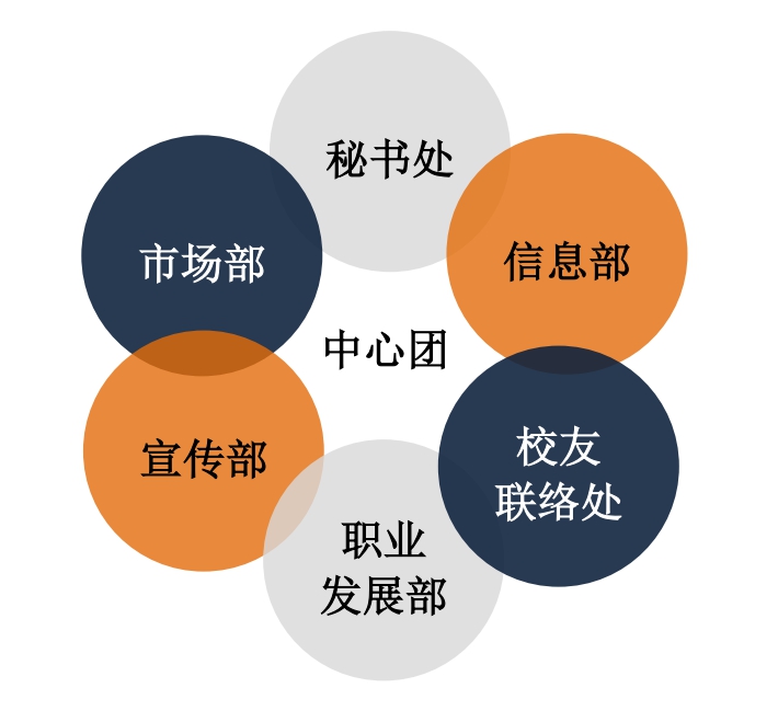 职拓下设:中心团和市场部、信息部、宣传部、秘书处、职业发展部、校友联络处6大部门,在中心老师的指导下,中心团带领各部门各司其职,通力合作,为悉商学子实习就业与职业生涯发展提供服务。