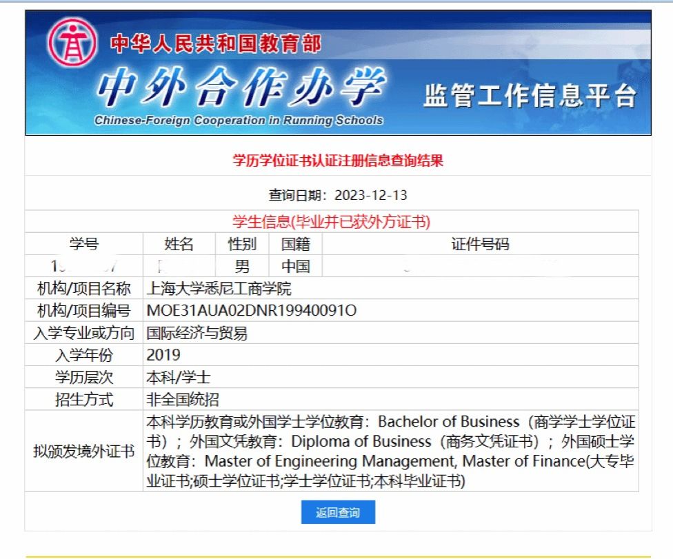 凡在我院就读完成所有课程后,获得的海外合作大学——澳大利亚悉尼科技大学学士学位的毕业生皆可获得教育部中外合作办学学历学位认证,同时可在中外合作办学监管信息平台进行学历学位证书认证注册信息查询。