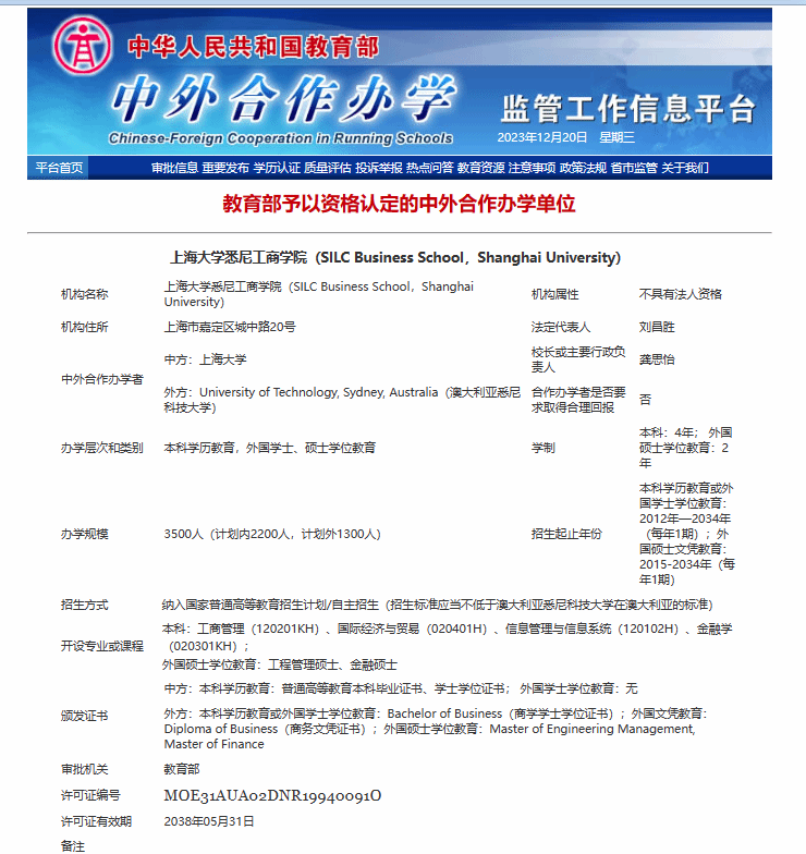 以下为我院在教育部中外合作办学监管工作信息平台的资格认定信息